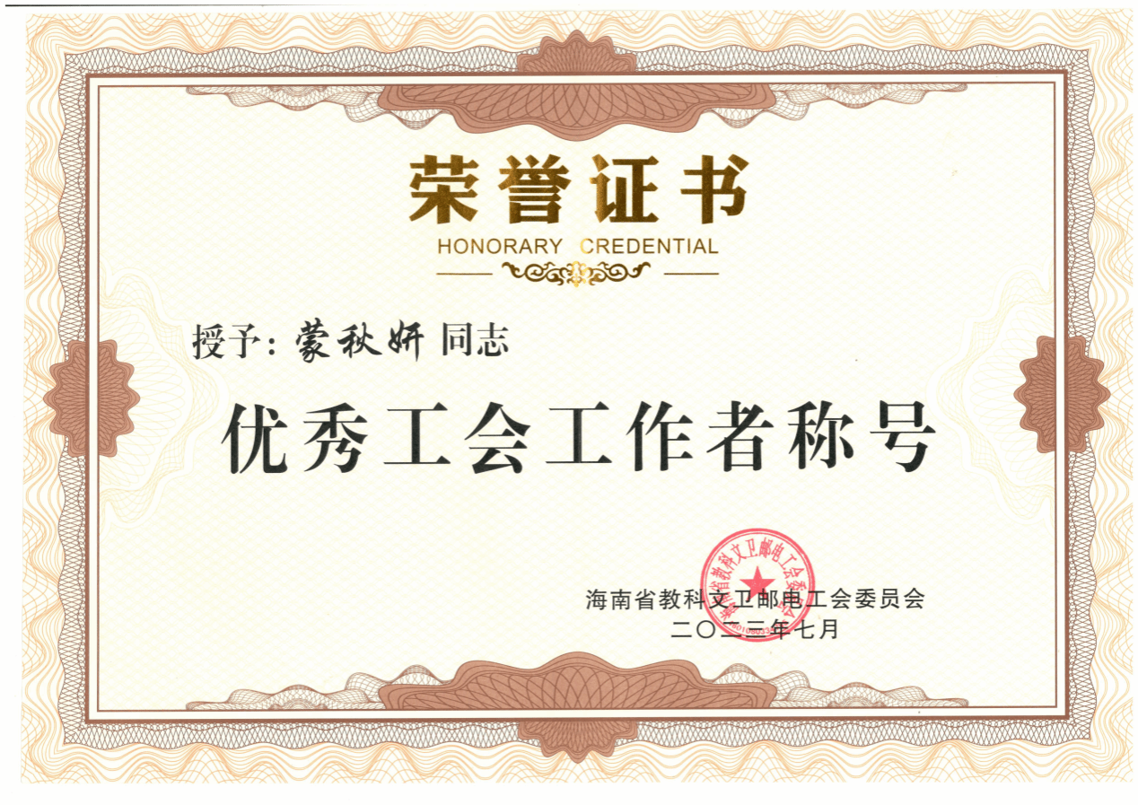 近日,海南省教科文卫邮电工会第二次代表大会在海口召开。会上对2021-2022年度海南省教科文卫邮电工会系统先进集体和先进个人进行表彰。我校法学院蒙秋妍荣获“海南省教科文卫邮电工会系统优秀工会工作者”称号。