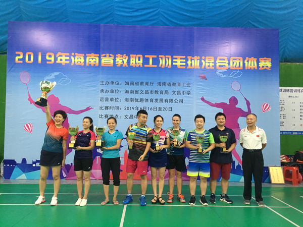由海南省教育厅、海南省教育工会主办的两年一届教职工羽毛球混合团体赛于2019年6月16-19日在文昌市举行。经过三天的激烈角逐,我校羽毛球健儿奋力拼搏,力克群雄,取得优异的成绩,蝉联三届冠军和荣获“优秀道德风尚奖”。