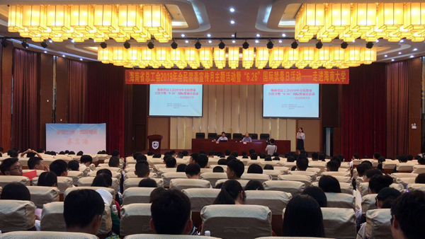 6月25日,全民禁毒宣传月暨“6.26”国际禁毒日活动在我校社科楼报告厅举行。此次活动由海南省总工会主办,我校工会承办,旨在向我校学生普及识毒防毒拒毒知识,倡导大家健康、绿色、阳光、文明的生活。