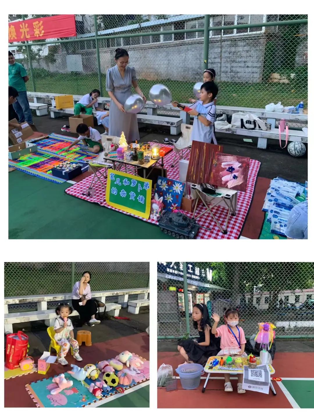活动开始,在家长的帮助下,孩子们忙碌起来,张贴宣传海报,布置摊位,摆放琳琅满目的商品,忙的不亦乐乎。