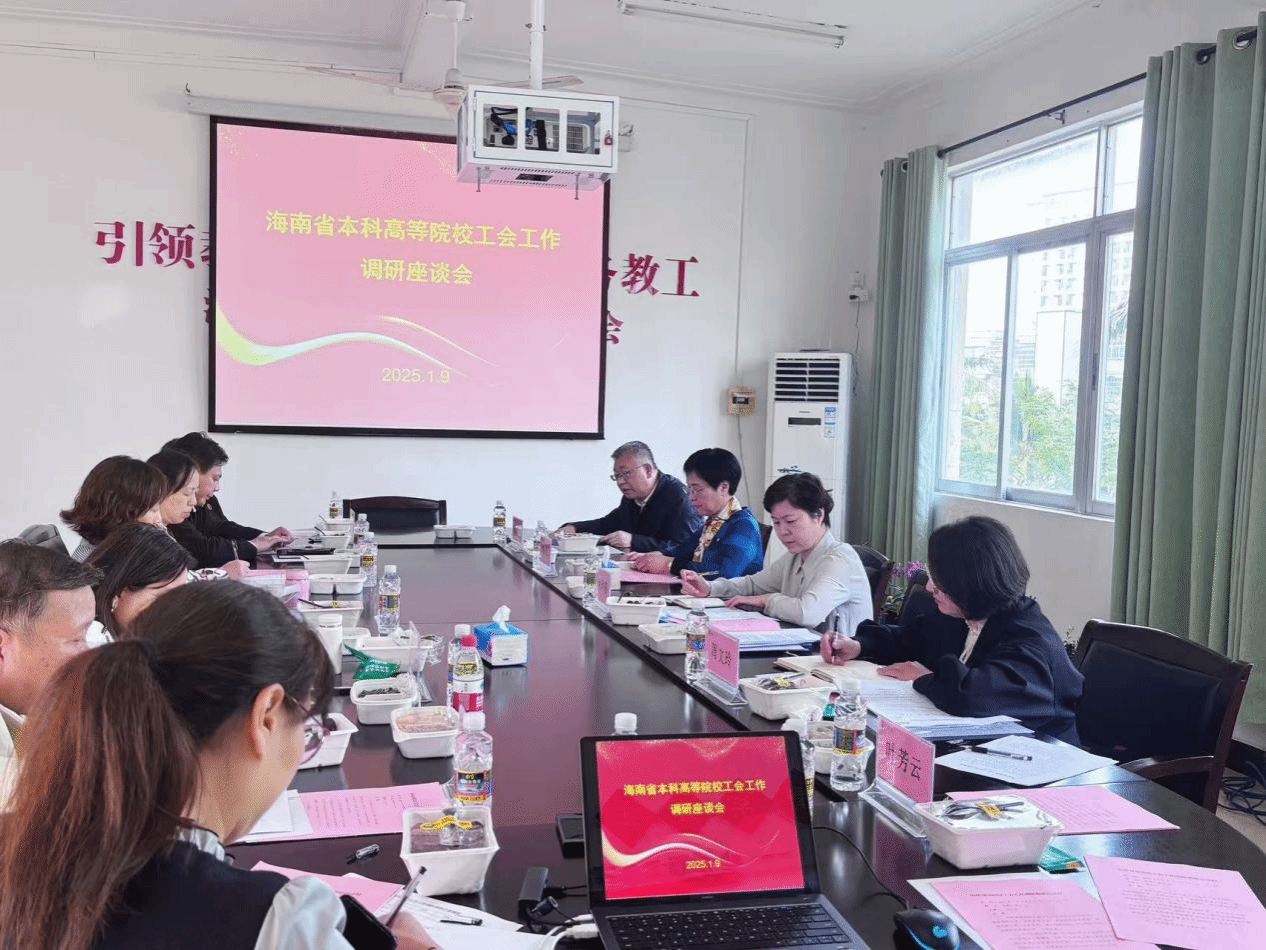 2025年1月9日,海南省教育工会在william威廉中文官网召开本科高等院校工会工作调研座谈会,学习《中共中央国务院关于深化产业工人队伍建设改革的意见》精神,交流总结2024年工作,研究谋划2025年工作。省教育工会常务副主席林洪珊出席会议并讲话,省教育工会副主席周文玲主持会议。